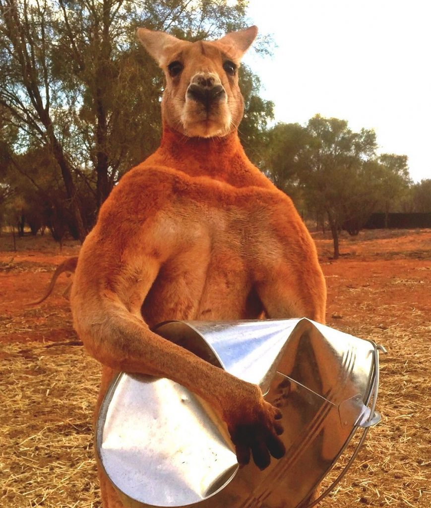 Bron: Kangaroo Sanctuary https://kangaroosanctuary.com/2017/07/roger-statue-project-channel-10/roger-and-his-crushed-bucket/